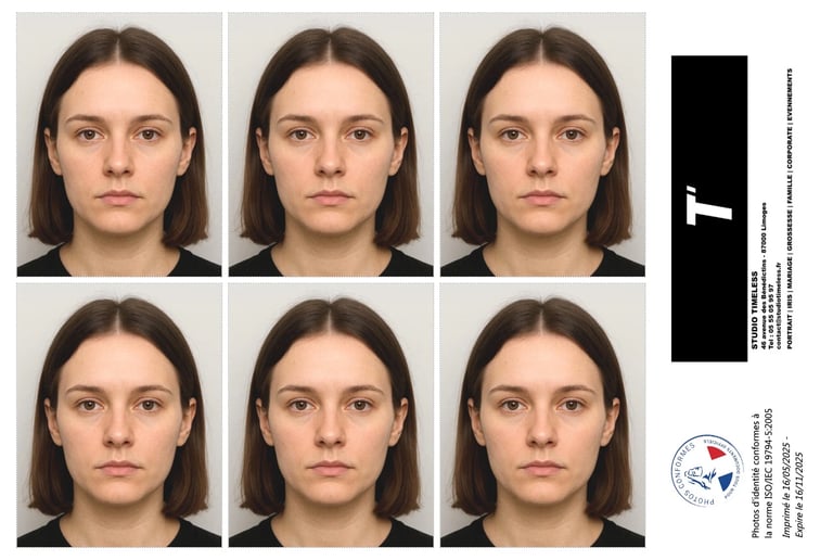 Les photos sont prises avec lumière professionnelle, cadrage précis et vérification automatique des normes, pour assurer une acceptation immédiate dans vos démarches.